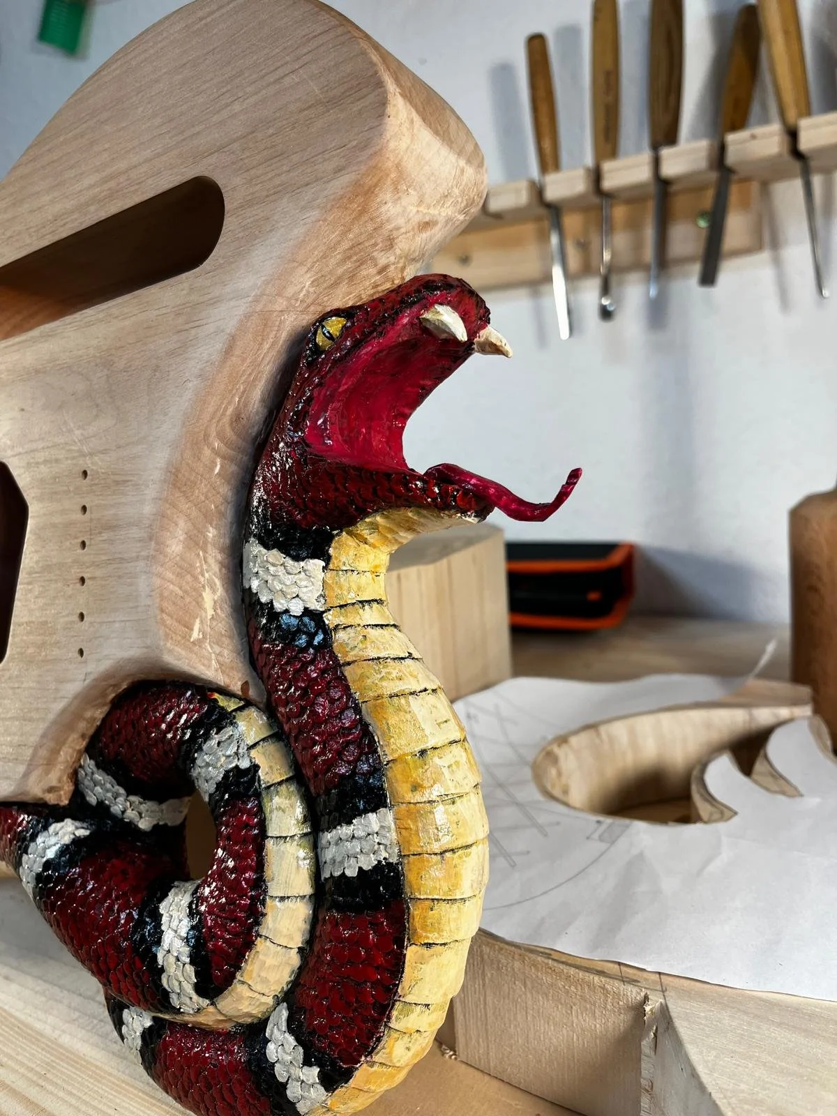 Im Team mit dem Holzbildhauer Florian Schubert entstehen in unserer kleinen Werkstatt neben den klassischen Gitarren auch handbeschnitzte E-Gitarren.